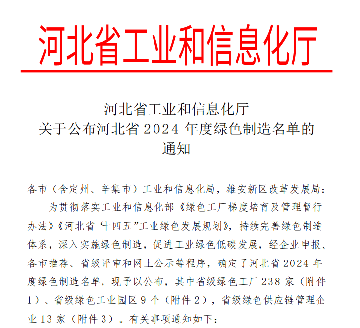 近日,河北省工業和信息化廳公布了2024年省級綠色制造示范單位名單,三孚股份憑借在綠色制造領域的顯著成績,獲得省級“綠色工廠”殊榮,標志著公司綠色發展理念和可持續發展成果獲得廣泛認可。