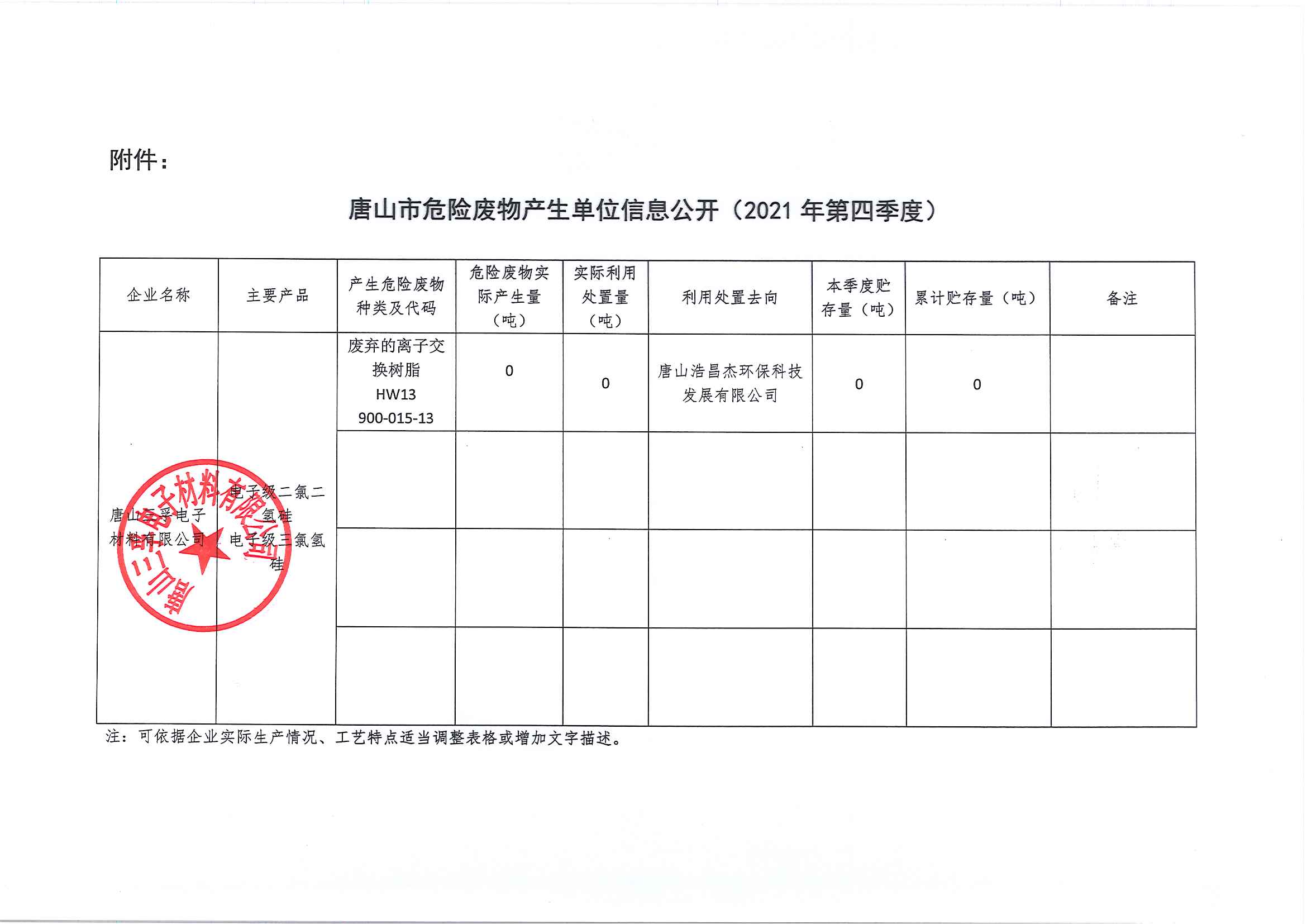 唐山三孚電子材料有限公司2021年四季度一般固體廢物信息公開