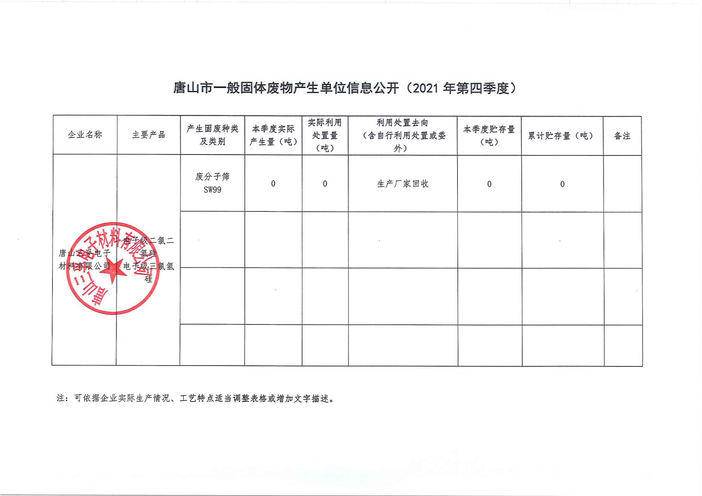 唐山三孚電子材料有限公司2021年四季度一般固體廢物信息公開