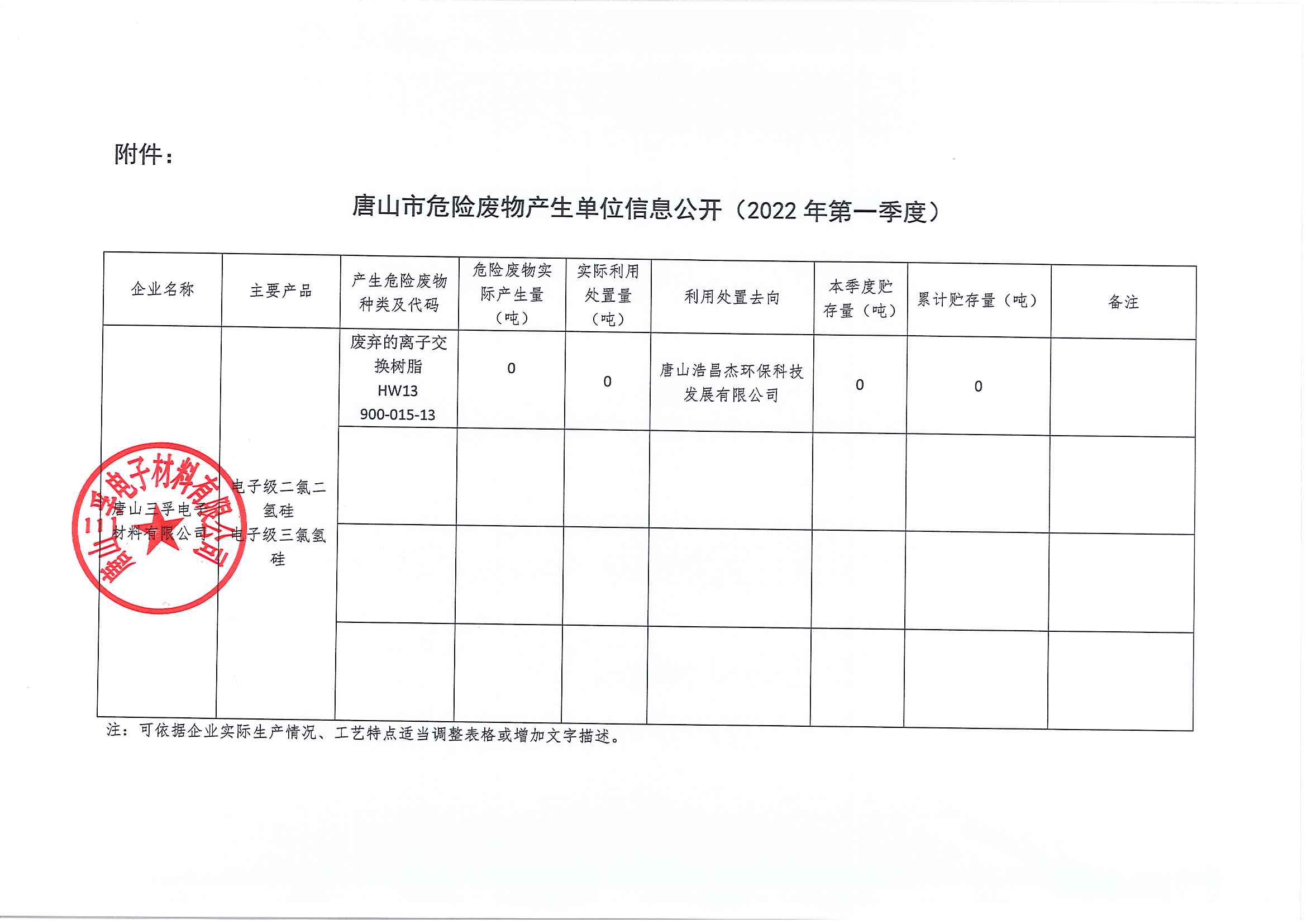 唐山三孚電子材料有限公司2022年一季度危險(xiǎn)廢物信息公開