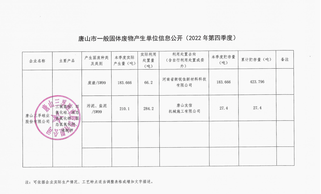 唐山三孚硅業股份有限公司2022年四季度一般固體廢物廢物信息公開